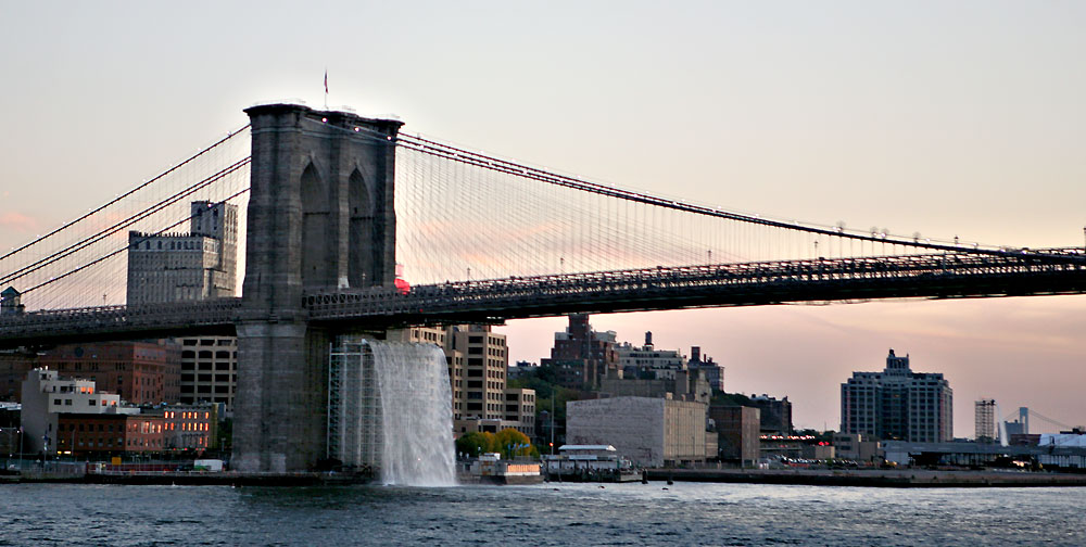 konstnären Olafur Eliassons tre vattenfall forsat under Brooklyn Bridge samt