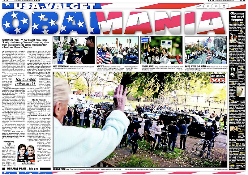 PS 2. Bilden nedan till vänster visar Obama som sitter i bilen och vinkar aldeles efter att han röstat i en skola i Hyde Park, Chicago. Det är en faksimil på hur det såg ut i VG. Den andra bilden är tagen utanför Grant Park på valdagen och de två sista är tagna i parken efter att Obamas seger var klar.