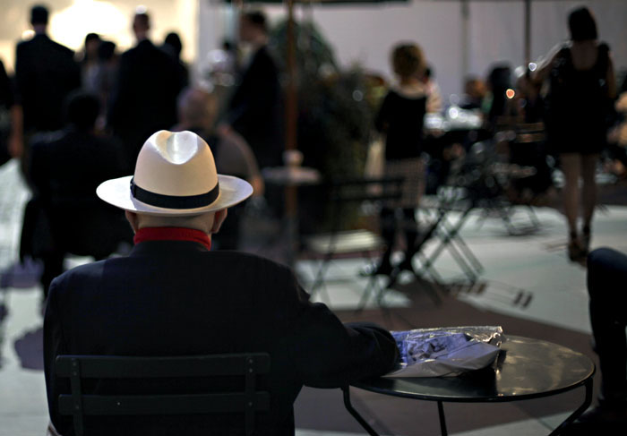 Modeveckan pågår där inne. Utanför trippar vackra kvinnor på höga klackar. Och