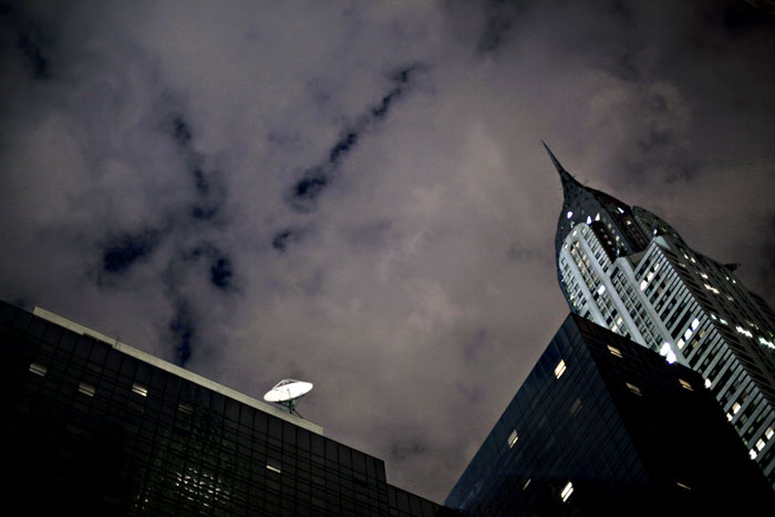 Manhattan lyser svagt upp de låga molnen ovanför Chrysler Building och i en tom