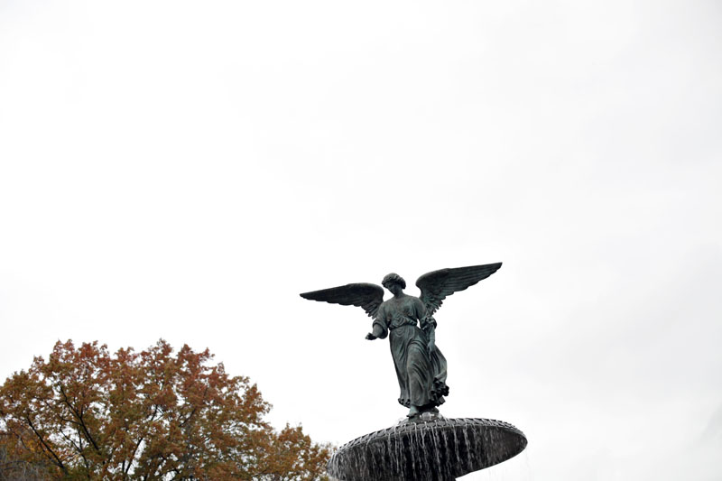 människor samtidigt som ängeln på fontänens topp tittar ner på mig. Mörkret lägger sig och det blir kyligt. Går upp mot