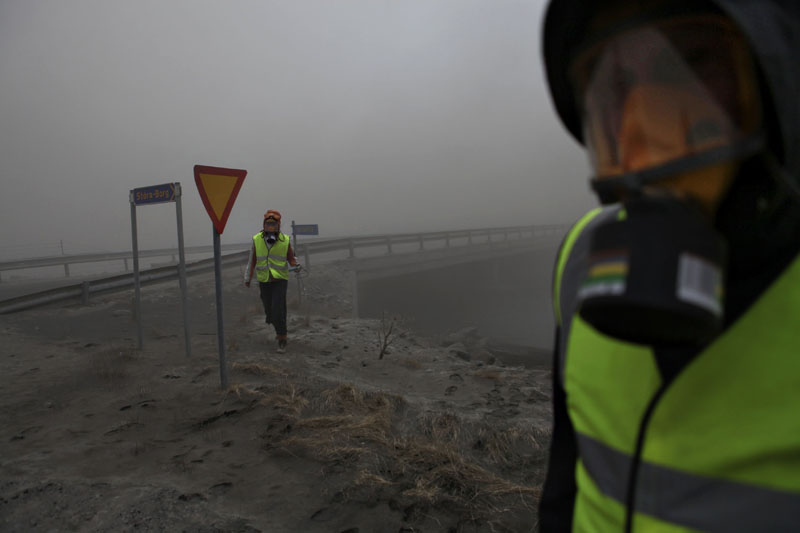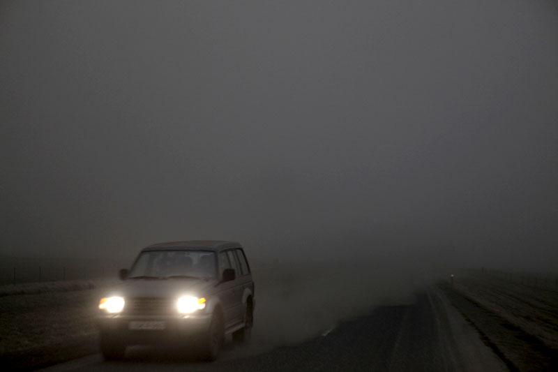Vi kör in i vulkanens askmoln. Det är mörkt.