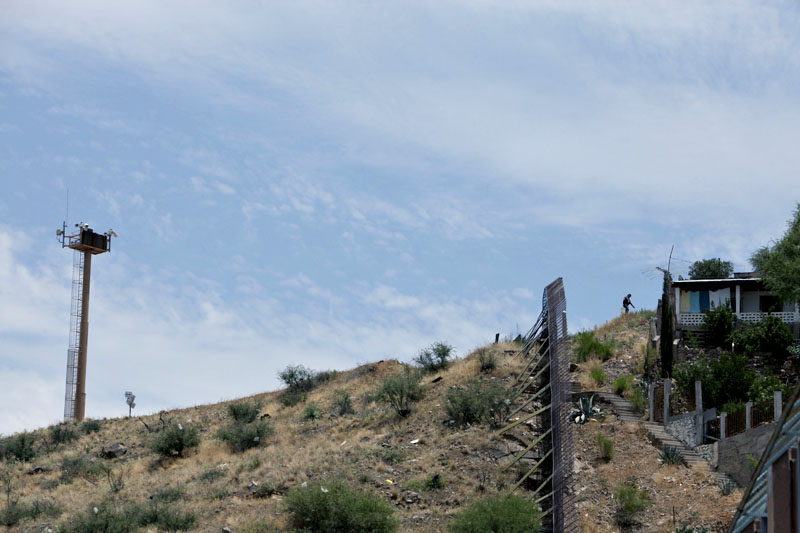 1. Till vänster en stolpe med övervakningskameror på den amerikanska sidan. Till höger syns Mexiko och en man som precis kånkat upp en stor hink med vatten för de branta trapporna.