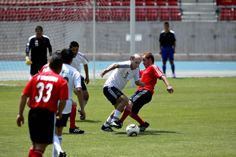 Till vänster i bildens mitt (och i bilden nedan) syns Franklin Lobos. Han spelade med Chiles landslag i OS 1984 i Los Angeles. Han är också en av de 33 gruvarbetare som satt fast i San José-gruvan i över två månader. Till höger med pokalen är Chiles president Sebastian Pinera.