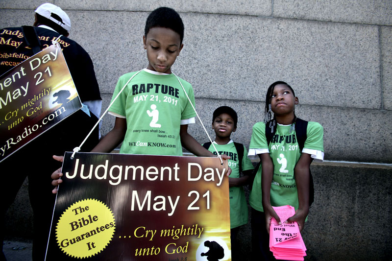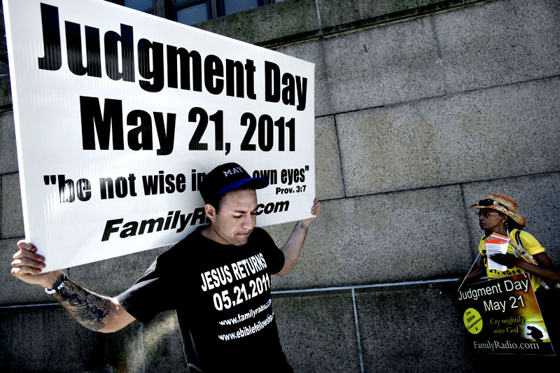 En tjock man som sålde små såpbubbelmaskiner överröstade ropen om judgment day med sitt mantra ”I’m the bubble man from bubble land” och en affärsman i kostym skrek "Holy shit. Only nine days? I better hurry up having fun.”