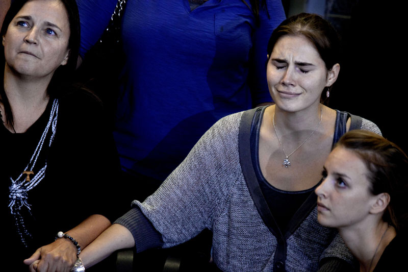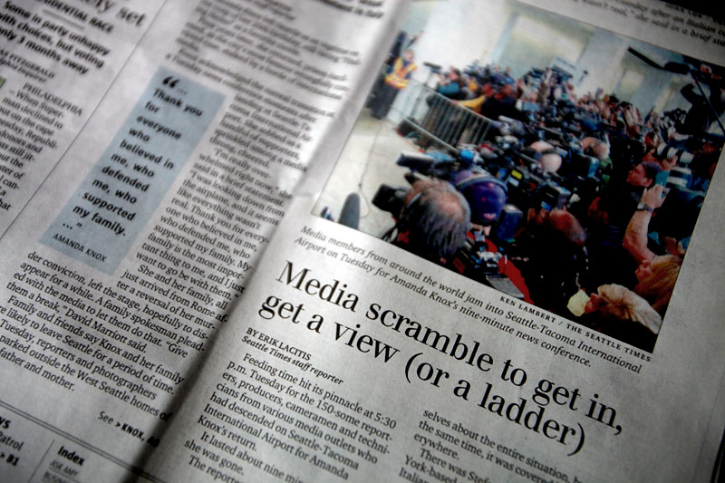 Jag är i Seattle i USA:s nordvästra hörna och jobbar. Det är vackert här men regnar mycket. Reporter Eirik och jag flög från New York på tisdagen och landade på flygplatsen här ett par timmar innan Amanda Knox med familj (bilden nedan) landade. Hon är studenten som i Italien blev dömd för mord av sin engelska rumskamrat för fyra år sedan. Hon har hela tiden hävdat att hon är oskyldig och när fallet var uppe för prövning så blev hon frisläppt.