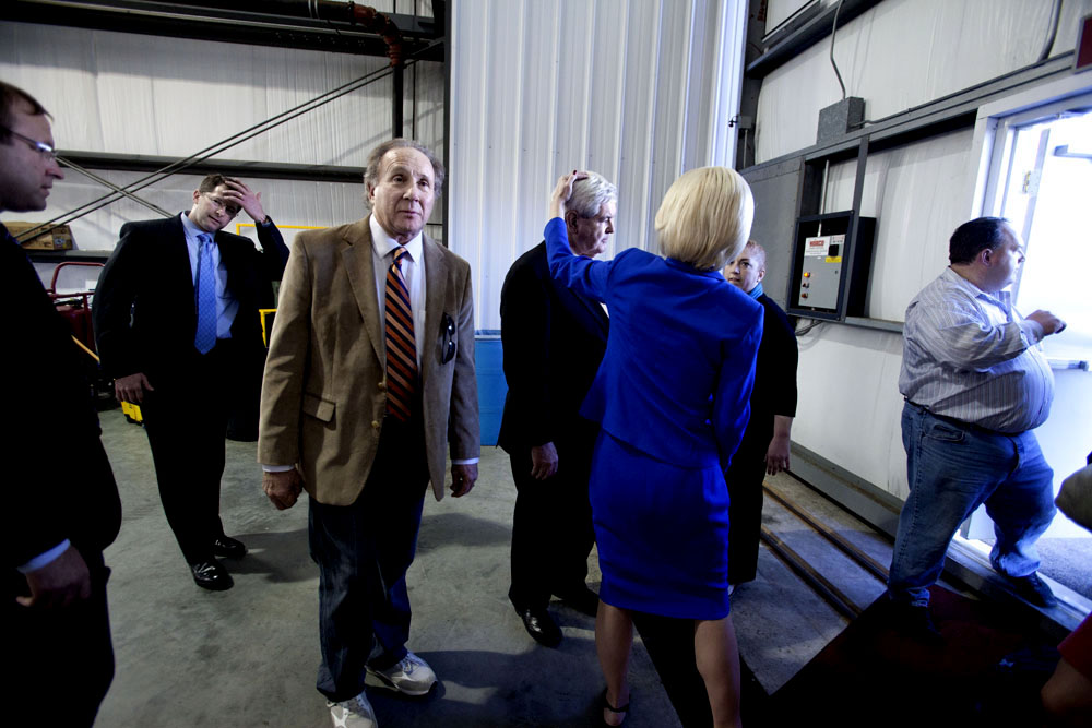 Den här bilden tog jag i måndags innan ett valmöte som Gingrich hade i en flyghangar i Tampa. Ronald Reagans son Michael (i mitten) stödjer Gingrich och var på plats. Vi fick en intervju med honom men jag hade ingen bild med honom och Gingrich tillsammans. Reagan var uppe på scenen och talade men försvann backstage innan Gingrich hade kommit upp. Jag smög mig in i backstageområdet där jag egentligen inte fick vara. Visste att Gingrich var utanför hangaren och gav intervjuer till lokala TV-stationer före han skulle hålla sitt tal. Jag hoppades att han skulle komma in snart och att jag inte skulle bli utkastad innan. Stod och låtsades som jag hörde hemma där och försökte se upptagen ut med iPhonen. Helt plötsligt kom Gingrich och ställde sig bredvid Reagan och sekunderna senare började Newts fru Callista rätta till hans frisyr.