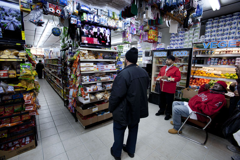 Efter det kör vi ner till Newark. Där är området runt omkring New Hope Baptist Church avspärrat flera kvarter från kyrkan. Pressfotografer står på höga stegar med långa objektiv för att försöka fånga någon av alla celebra begravningsgäster flera hundra meter bort. Ingen mening för mig att ägna en hel dag åt det. De bilderna kommer från bildbyråerna och vårt jobb är att göra ett eget reportage som skapar närvarokänsla. Dock inte så många sörjande fans där som vi hade förväntat oss. Ett par dussin vid den avspärrning vi stod vid. Några stod inne i en matbutik och tittade på den direktsända begravningen på en TV. Polisen hade ju uppmanat folk att stanna hemma och det verkade som att folk hade lyssnat.