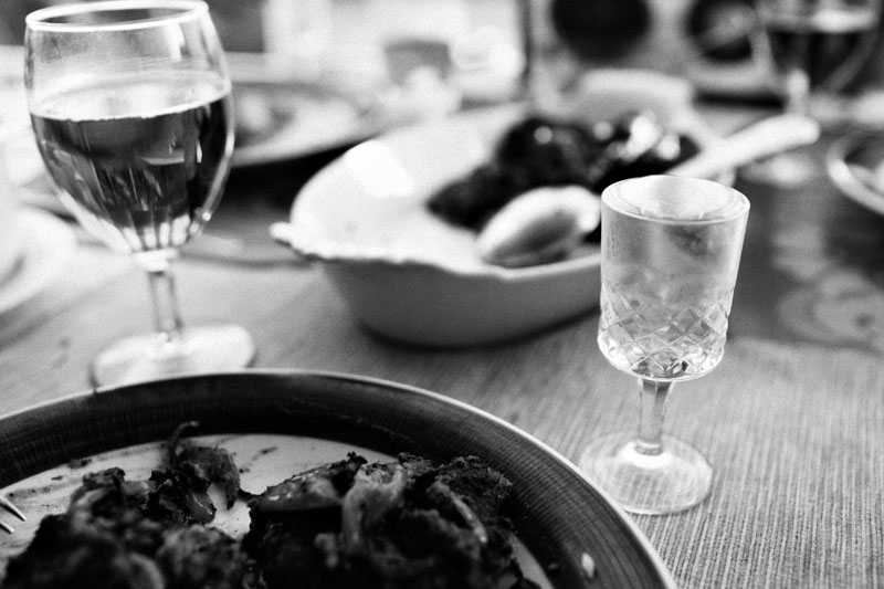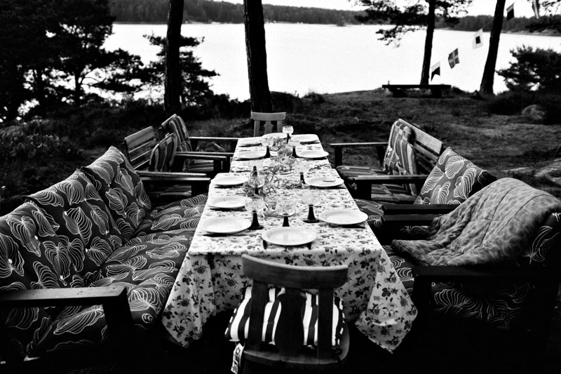 provisorisk festplats ute i skärgården. Omgiven av hustru och vänner. Med en