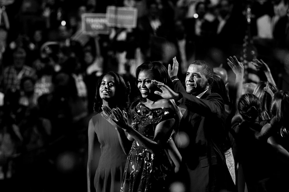 Jag hade skaffat mig en ganska bra position för Obamas tal och stått där i fyra timmar innan och lyckats hålla mig kvar när brandmännen körde i väg folk runt omkring mig. Obama kom och han talade. Reporter Eirik var på annan plats i arenan. Där hans presskort gällde. Vi hade bestämt oss för att han skulle komma till mig efter talet, som vi gjort kvällen innan med Clinton, så vi kunde göra video, en stand up samt ett par intervjuer med publiken. Eirik lyckades snacka sig in till den sektion där jag stod precis innan talet var klart trots att hans presskort inte gällde där. Så det betydde att vi kunde få en stand up med Obama i bakgrunden när hans familj kommer in på scenen. Perfekt. Trots att mitt fotografhjärta nog hellre vill att jag tar stillbilder av det så är ju detta bättre för VGNett som vi ju levererar dessa sena nyheter till. Eirik pratar in i mikrofonen jag filmar och bakom står familjen Obama och vinkar medan konfettin faller över dem och Eirik. Hinner ta några få stillbilder precis innan de går av scenen men då är det mycket mer folk där och blir inte lika ren komposition. Dessutom har yngsta dottern försvunnit i vimlet. jaja, vi har ju videon. Trodde jag.